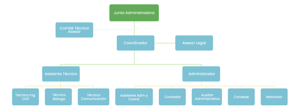 La Junta Administradora se creó según lo establecido en el Artículo 42 de la Ley Forestal Áreas Protegidas y Vida Silvestre, la cual está conformada por nueve integrantes institucionales.